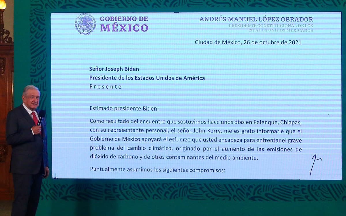 El presidente Andrés Manuel López Obrador leyó la carta que envió a su homólogo de Estados Unidos, Joe Biden, para anunciarle el apoyo que daría México a la Conferencia de las Naciones Unidas sobre el Cambio Climático (COP26) a través de siete compromisos: